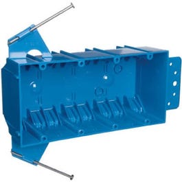 4 Gang, New Work Box, With Captive Nails & Molded Bracket, 55 CUIN, 12 Integral Clamps, 7-3/5" x 3-7/10" x 2-1/2", PVC Construction, Non-Conductive, Non-Corrosive, & Lightweight.
