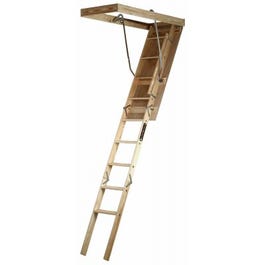 25.5" x 54" x 8'9" wood fire treated attic stairways, fits 7' to 8'9" ceiling heights, double hinged joints, steps with wire rod supports full width door hinge, adjustable spring tension, rated for 250 lb.