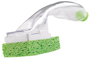 Natural absorbent sponge. Liquid soap dispenser handle allows the soap to flow into the sponge provides efficiency in dishwashing. Built-in scraper gets baked on messes.