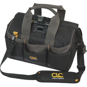 BigMouth design gives easy access to tools and accessories. Heavy-duty zipper closure. Integrated LED (light emitting diode) light can be easily directed at work area or into tool carrier. 3 levels of light output allow adjustment for wide area illumination or close-up work. Ergonomic handle design is padded to reduce stress on hand and wrist. Adjustable padded shoulder strap for easy carrying. 11 multi-use inside pockets and 18 outside pockets help organize tools. Base pad feet help reduce wear and abrasion. 2 AAA batteries included.