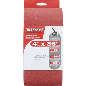 Diablo's assorted sanding belt packs include a variety of grits needed to complete your sanding project. Featuring break-through innovations, Diablo's sanding belts improve performance, extend life and increase productivity, saving you time and money on the job. Coated in a premium zirconium grit blend, these belts remove material faster and offer an extra long sanding life. Clog-SHIELD, Diablo's own blend of grinding agents, reduces loading thus maximizing productivity. The superior grit-to-backing bond, ENDURA-BOND, provides Diablo's sanding belts with longer life and extreme durability.