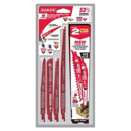 Diablo, 6 piece, bi metal, reciprocating set with 2 free carbide reciprocating blades, set includes: 9" nail embedded wood blade, (2) 6" nail embedded wood blades, (2) 6" metal cutting blades & 6" metal demolition blade, perma shield coating protects these blades from heat, gumming & corrosion, hooked tips on woodcutting blades to bite into material & hold on throughout entire cut without slipping, double tooth configuration, blades teeth are spaced closely together for smoother, faster cuts, storage sleeve keeps blades safe from elements when not in use, variable tooth design, wood cutting blades feature easy plunge tip design for faster & easier plunging, wood cutting blades suited for cutting wood, wood composites & nail embedded wood, metal cutting blades suited for cutting steel & metal composites.