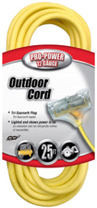 3-conductor SJTW, 125V vinyl extension cord. 12 gauge. 12/3 AWG. 15 amps. Water resistant jacket and insulation. Heavy-duty strain relief prevents cord and plug separation. UL listed. Meets OSHA requirements for outdoor use. Yellow.