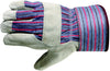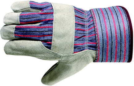 Pearl gray split cowhide leather palm, thumb, forefinger, and knuckle strap. Safety cuff, wing thumb, and bound hem. Gunn cut. Split cowhide leather suede palm. Package of 2.